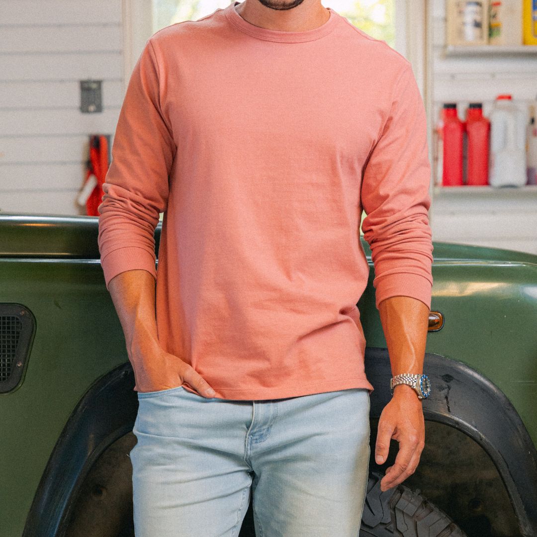 Model wearing a Washed Crimson long sleeve tee Men's long-sleeve crewneck T-shirt in dusty rose on white background male model in salmon long-sleeve crewneck shirt and olive pants, side view (shoulders to mid-thigh), hands clasped. Male model wearing a dusty-rose long-sleeve crewneck shirt and olive pants; torso and hands visible. Coral crewneck t-shirt with neck label reading Maysy, MEDIUM, 100% COTTON, MADE IN VIETNAM Close-up of a washed crimson long sleeve cuff on a garment made of soft fabric