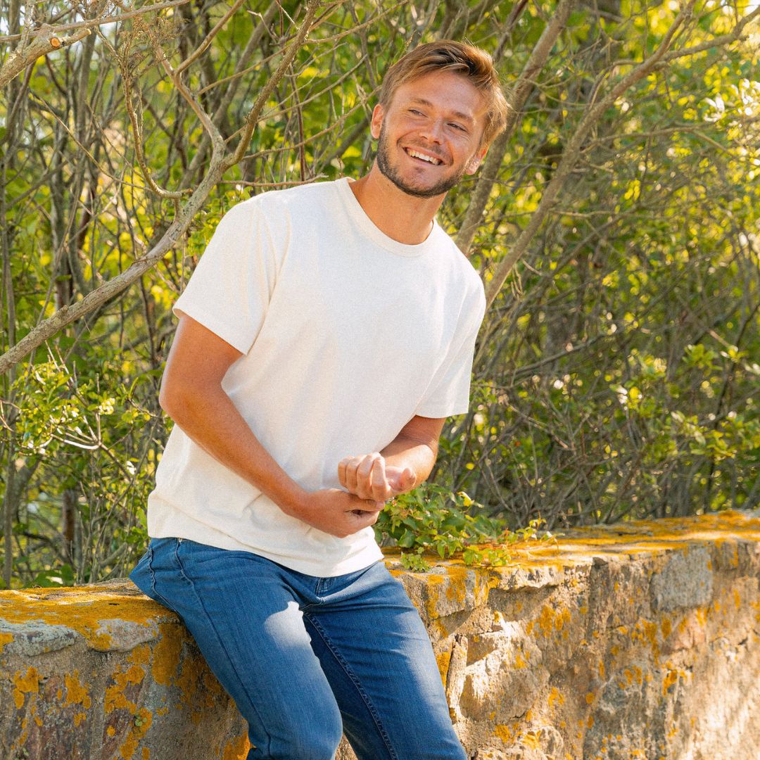 Man adjusting the sleeve of a plain white T-shirt, wearing blue textured shorts, against a white background Plain white T-shirt laid flat on a white background Man wearing a plain white short-sleeve T-shirt and blue textured shorts, standing with one hand in pocket Close-up of a white t-shirt collar with the brand name 'Mugsy' faintly visible inside the neckline. Smiling man wearing a white short-sleeve t-shirt and blue textured pants, shown from the side against a white background Close-up of white fabric twisted in a spiral shape showing texture and folds Man wearing a plain white short-sleeve T-shirt and blue textured shorts, shown from neck to hips.
