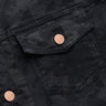 Close-up of black camouflage fabric with a pocket flap secured by a copper rivet stamped 'MUGSY EST 2008' Black camo-patterned jacket with button front and chest pockets, label inside collar reads 'Maysy CAMOS M' Men's vintage black camo jean jacket with stretch fabric, featuring buttoned pockets. Back view of men's stretch vintage black camo jean jacket Close-up of a black camo-patterned jacket collar with copper buttons and the brand name 'Mugsy' and the word 'CAMOS' printed inside the collar. Close-up of a black camo-patterned jacket sleeve with a copper button and a blue patch labeled 'Mugs4'.